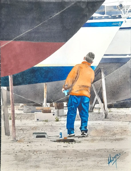 On repeint la coque 40x50 250€ Aquarelle de Dominique Thomas , peinture de la coque à la cale de la Landriais