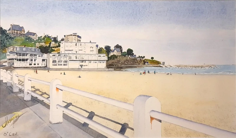 St Cast, les drapeaux 40x50 300€ Aquarelle montrant la plage et le quartier de l'Ile